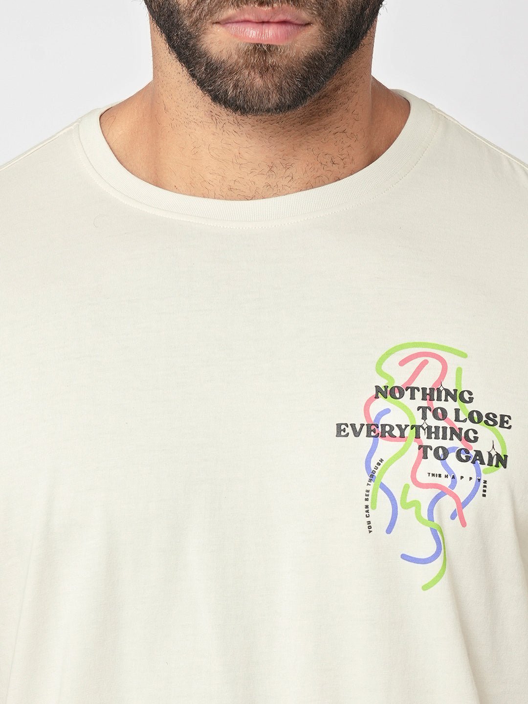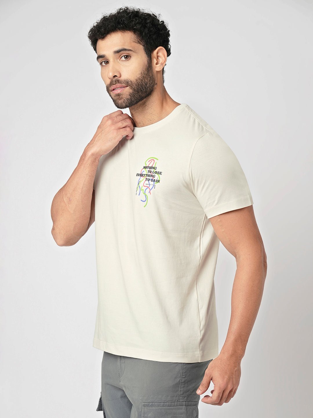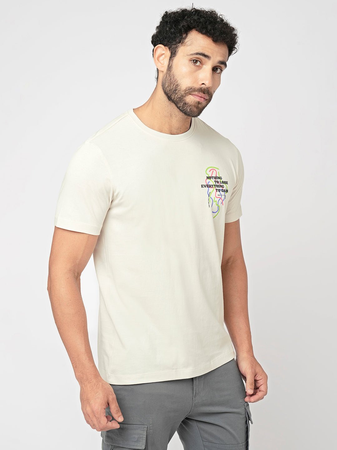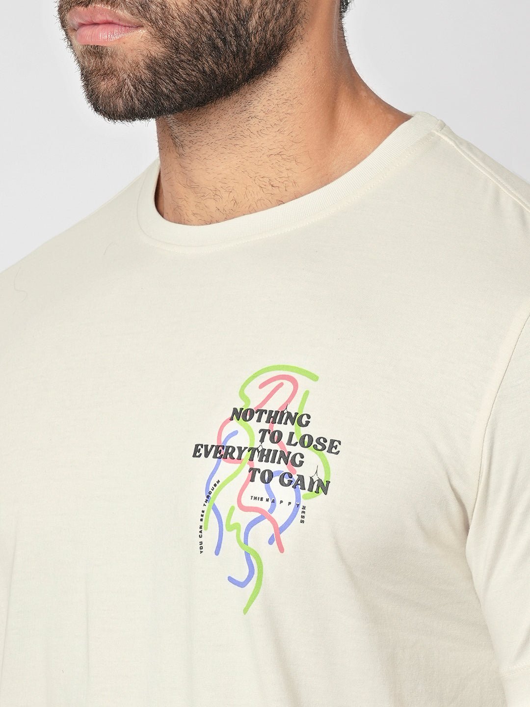 Stay effortlessly stylish with this off-white graphic T-shirt featuring a minimal yet inspiring "Nothing to Lose, Everything to Gain" printed design on the chest. The artistic line-drawing graphic adds a modern and trendy touch, making it perfect for everyday wear.