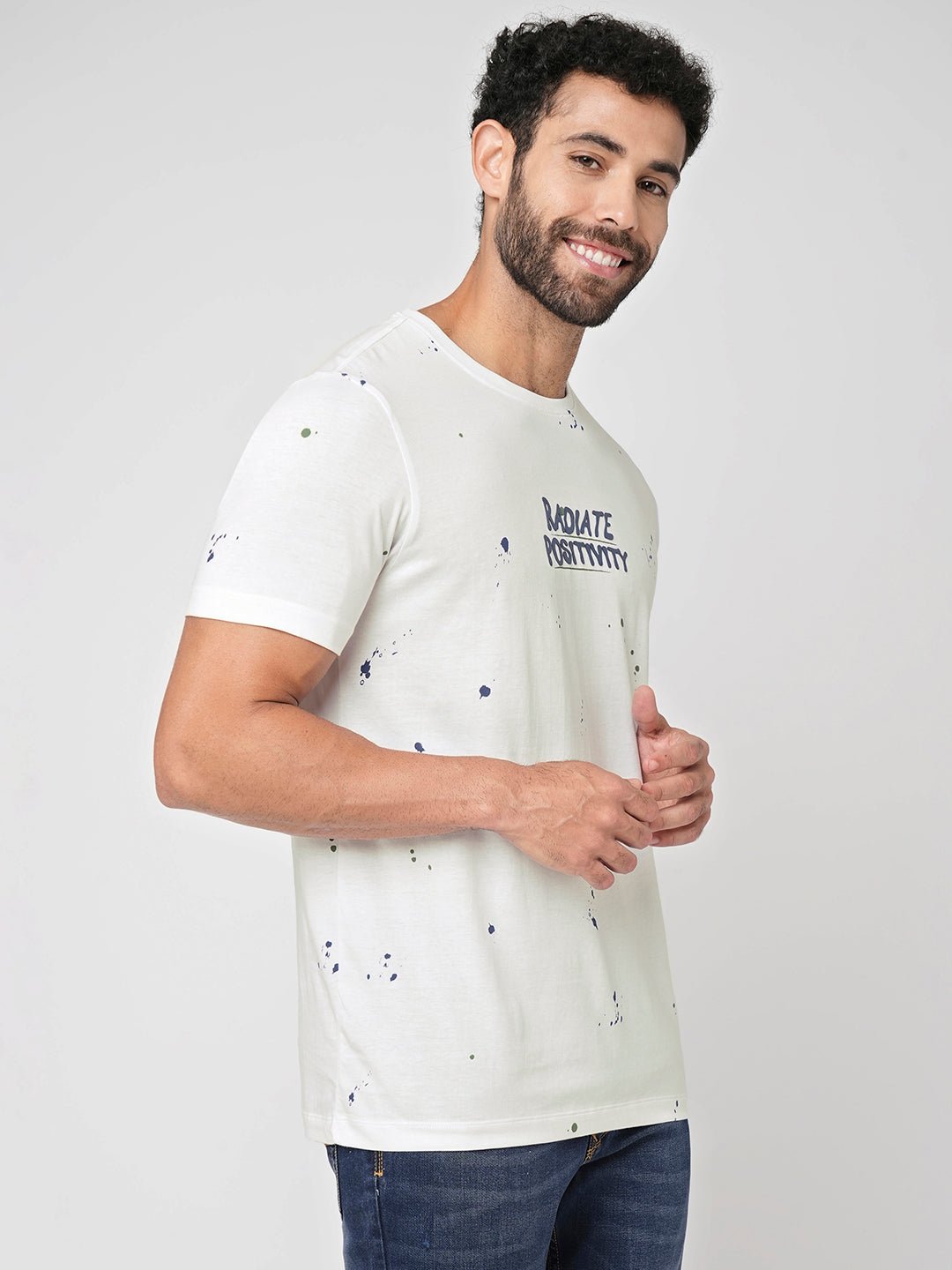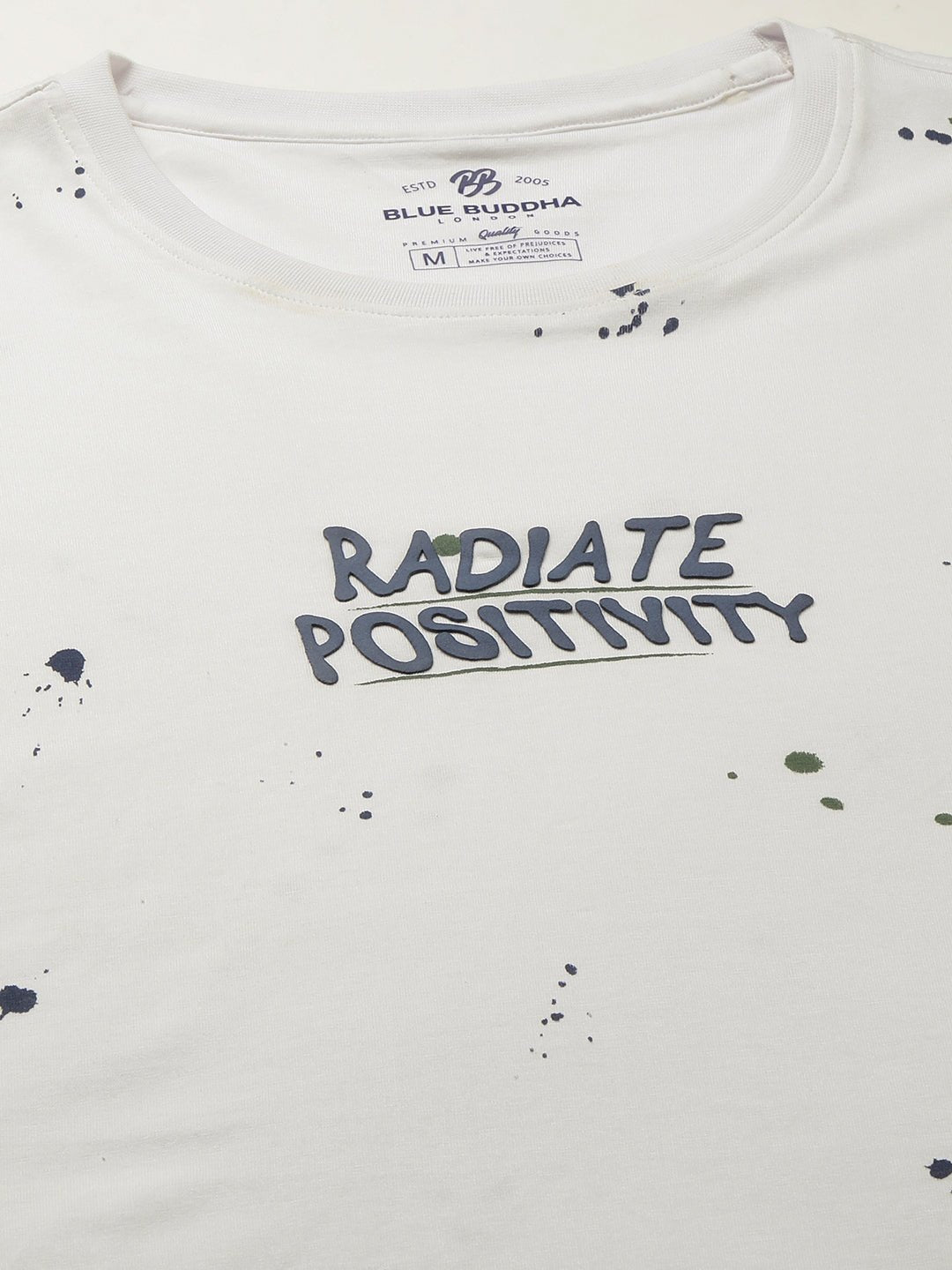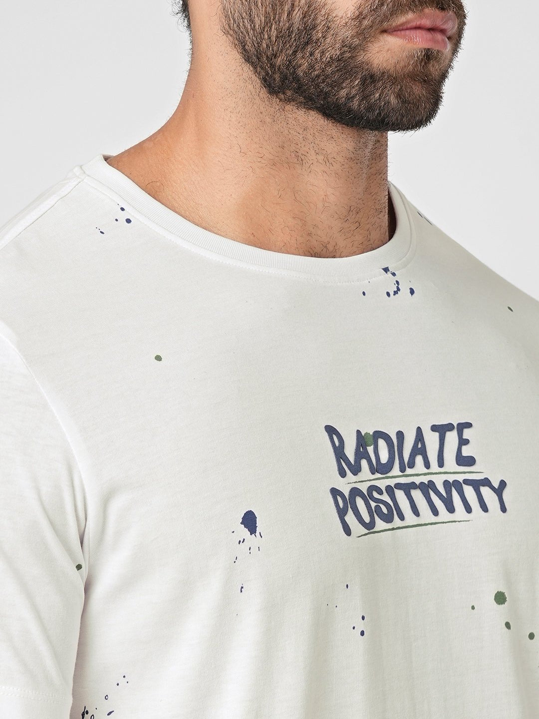 Spread good vibes with this white printed T-shirt featuring a motivational "Radiate Positivity" print on the chest. The paint splatter effect adds a trendy and artistic touch, making this tee perfect for those who love a stylish yet meaningful look.