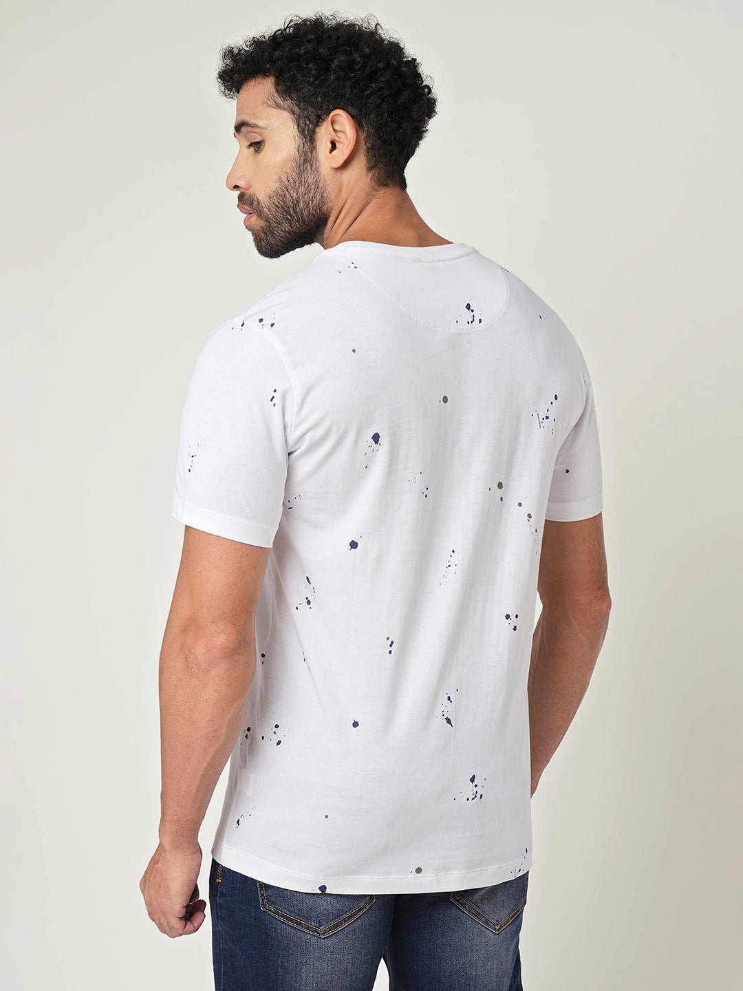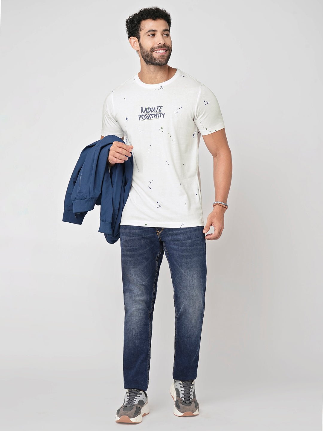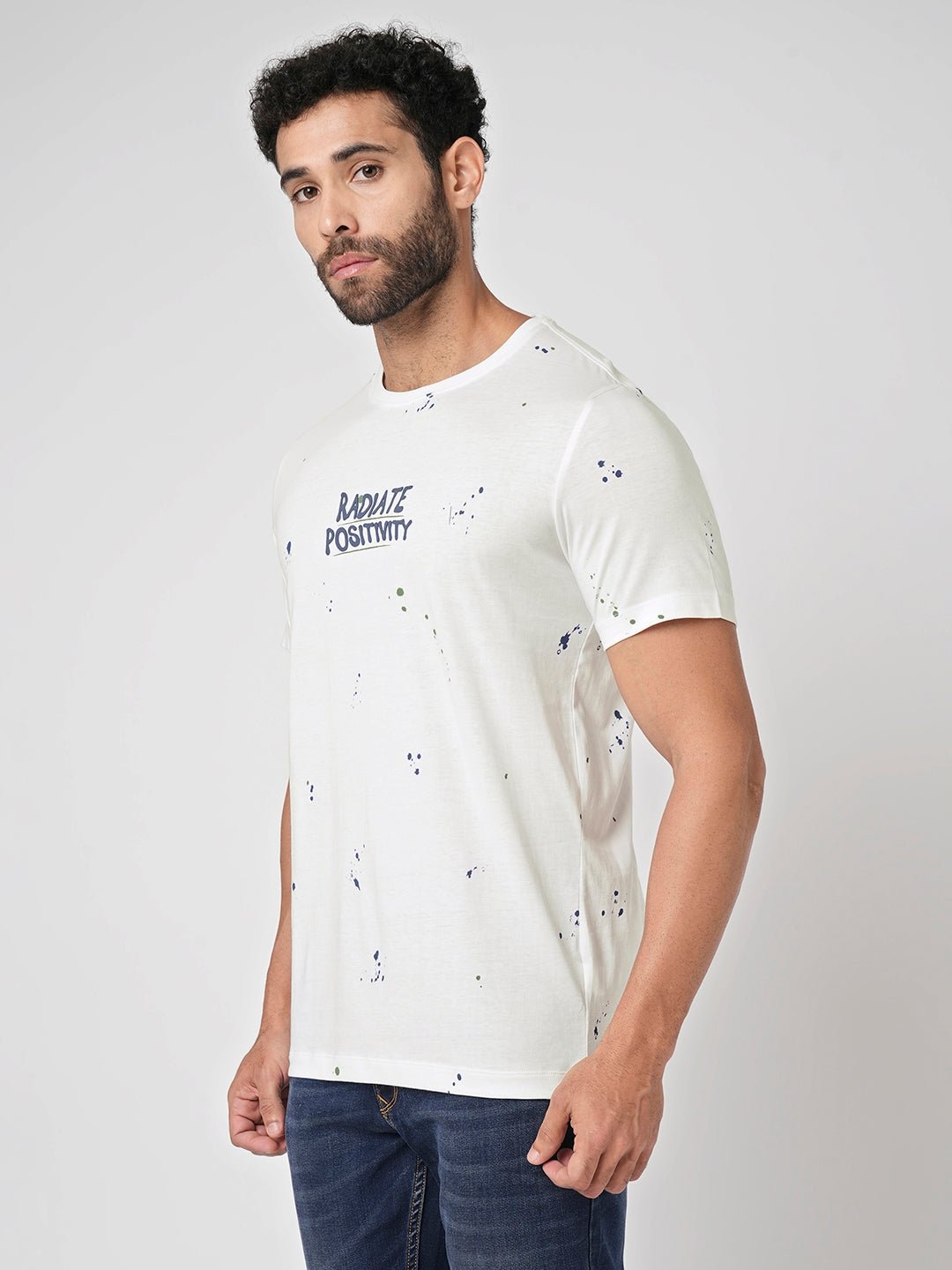 Spread good vibes with this white printed T-shirt featuring a motivational "Radiate Positivity" print on the chest. The paint splatter effect adds a trendy and artistic touch, making this tee perfect for those who love a stylish yet meaningful look.